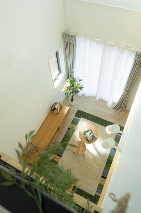 雲仙市のエアサイクルの家 大きな窓のある吹抜けがリビングを明るく照らします。家の中の温度が均一になる『エアサイクルの家』なら、吹き抜けのある空間も暖かく過ごせます。 こだわりのアイアンの手すりと階段淡い色でまとめられた空...