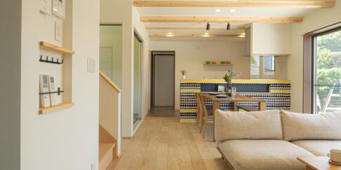吹抜から陽光がそそぐ明るいリビングの住宅。 青が印象的なキッチンはニッチやマガジンラックをつけてとことん使いやすく。玄関のすぐ横、シューズクローゼット内に手洗いを設け、毎日の帰宅後の習慣をスムーズに。こだわって作った洗面...